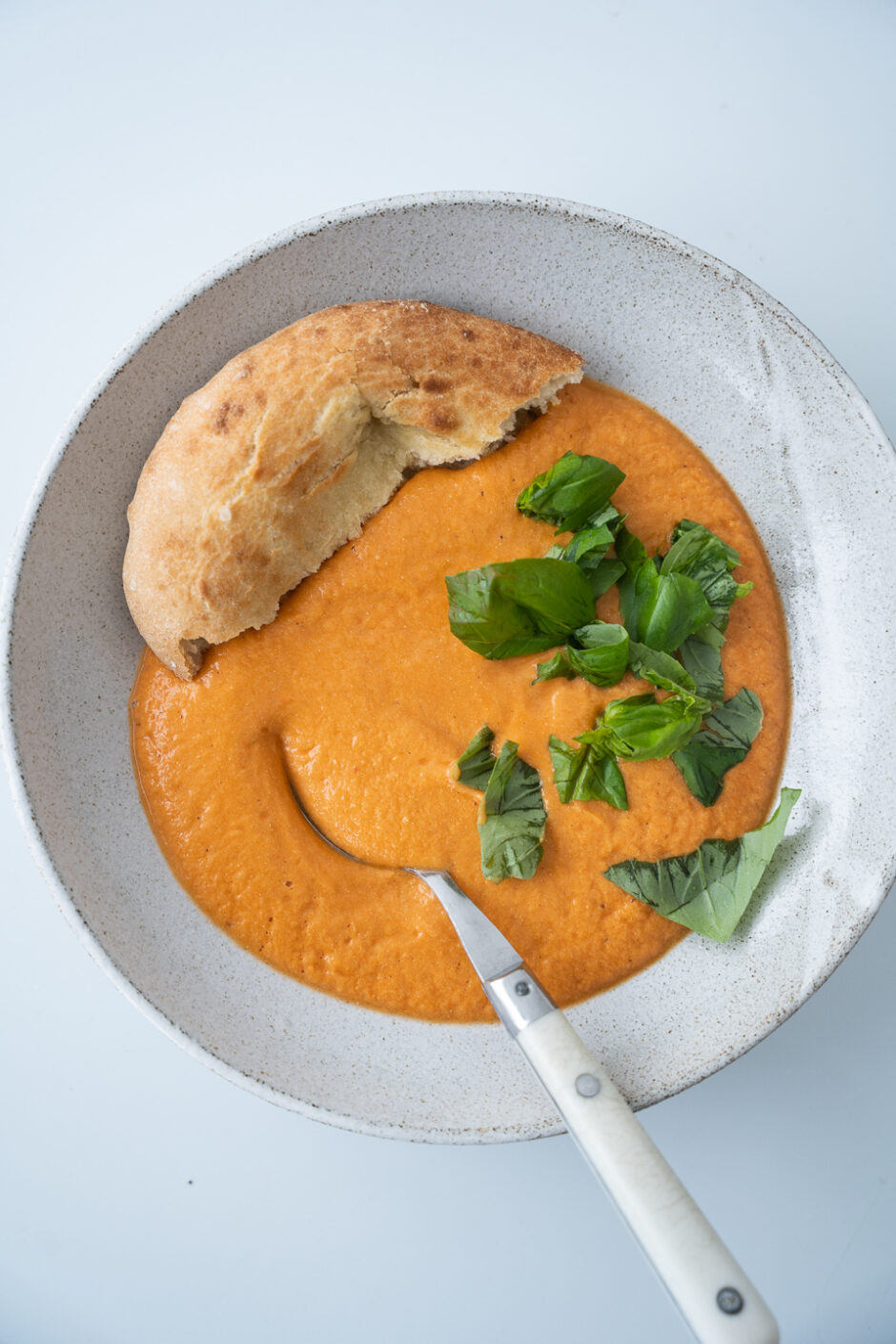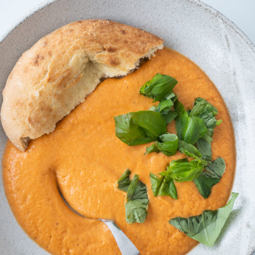 Hytteost suppe er en cremet og proteinrig vegetarisk grøntsagssuppe, der kombinerer ovnbagte tomater og peberfrugter med blød hytteost for en fyldig og mættende smag.