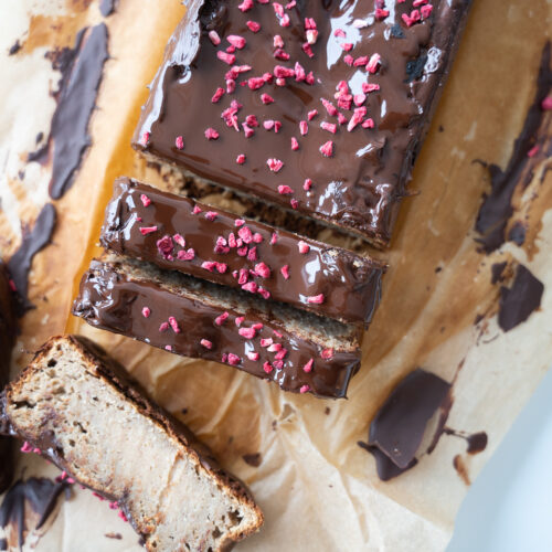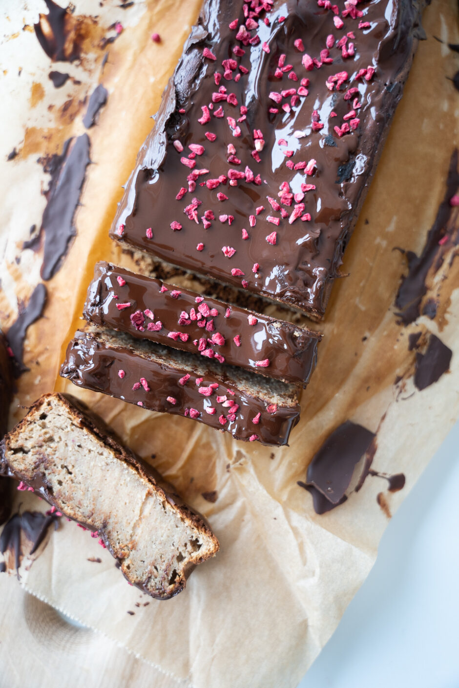 - Tag det ud af ovnen og kom mørk chokolade over. Lad det smelte og fordel med en ske. Drys med frysetørrede hindbær og lad det køle helt af.