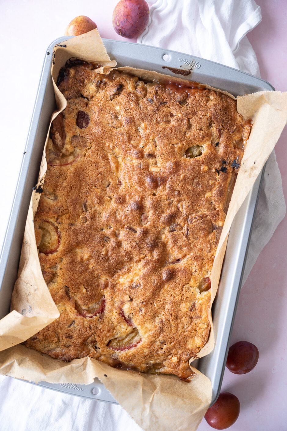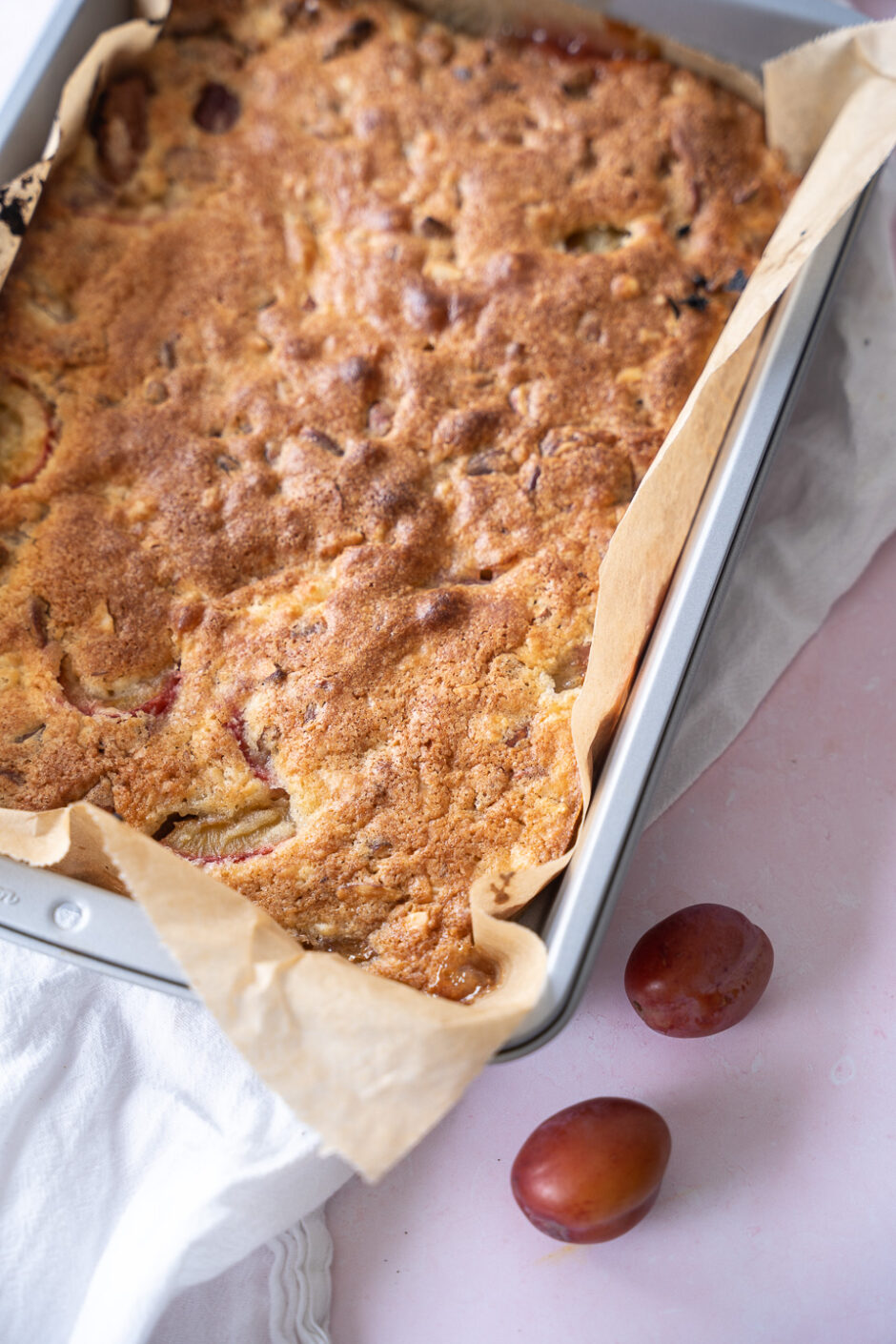 I vores nye have har vi et stort blommetræ. Det bugner med de skønneste blommer og en del af dem er allerede blevet brugt til denne vanvittigt nemme kage med blommer. Kagen består af et lag blommer, hvor der fordeles kagedej over. Kagedejen skal blot røres sammen i en skål og derfor kræver denne kage hverken røremaskine, håndmixer eller andre redskaber.