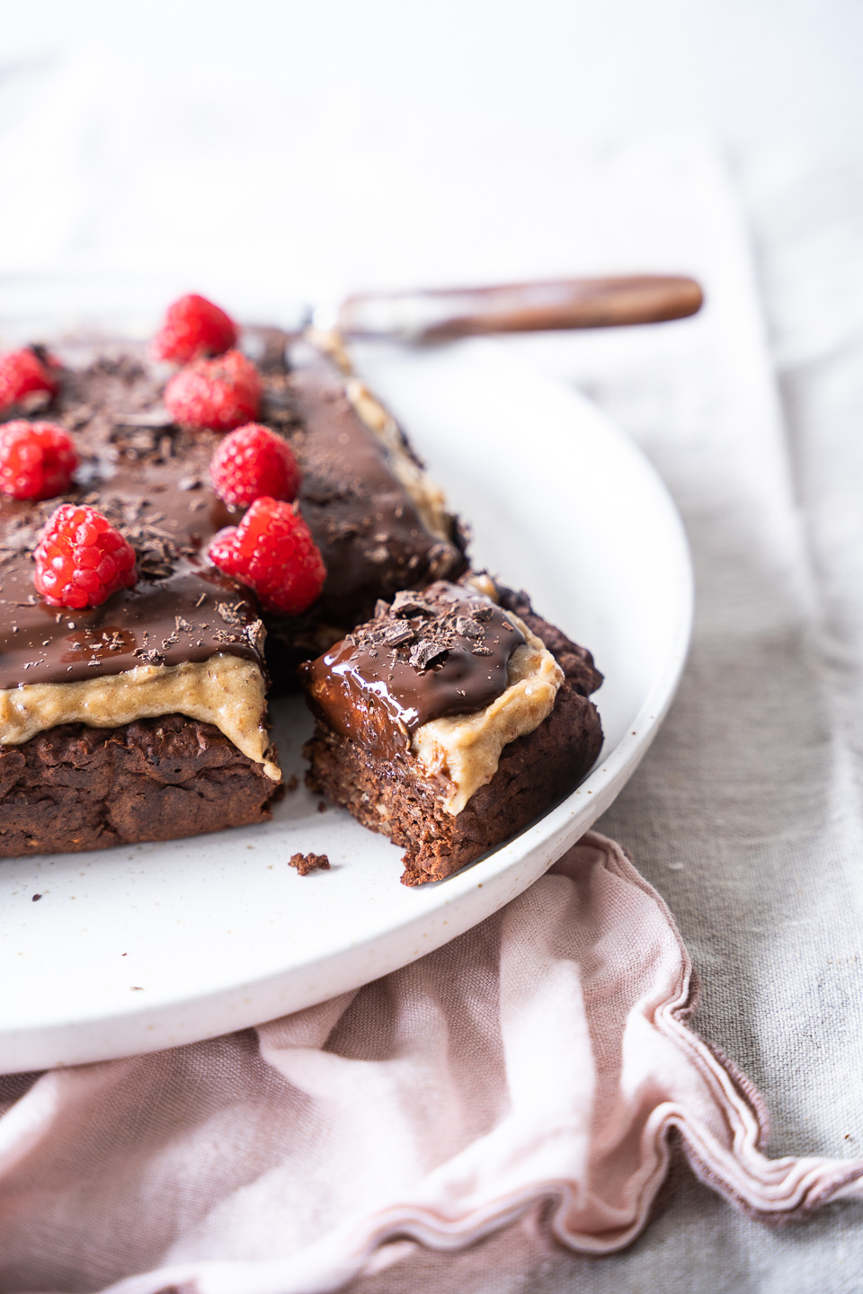 Her får I opskriften på en lidt ‘sundere’ brownie med sød kartoffel, dadler, havregryn, æg og andre gode sager. Den skønne kage er toppet med en slags tahin-karamel med dadler og til sidst et lag chokolade. Kagen er allerbedst dagen efter den er lavet og er derfor perfekt til gæster.