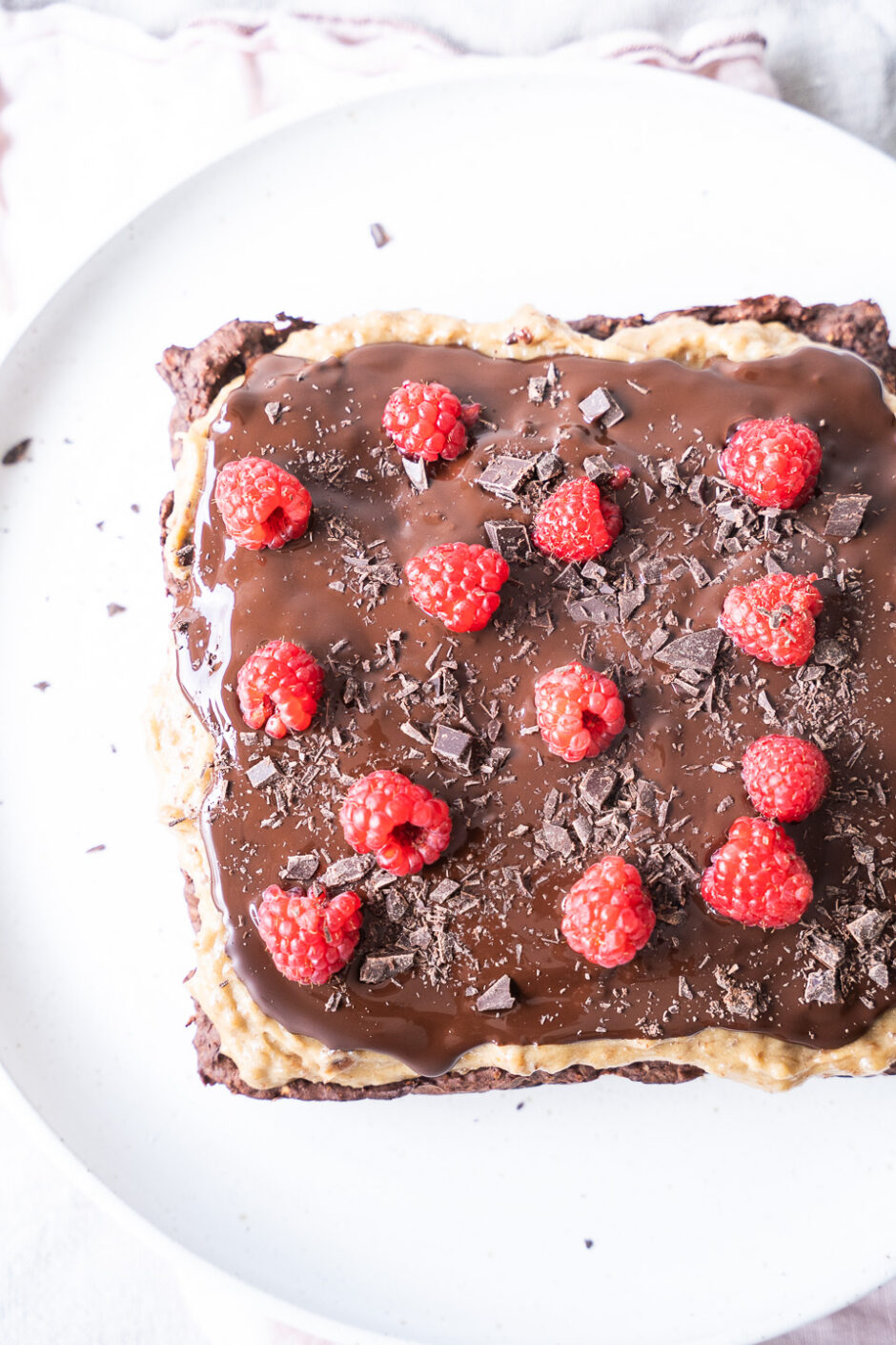 Sød kartoffel brownie med den lækreste tahin-karamel og chokolade på toppen. Denne kage er lavet med dadler, søde kartofler og andre gode sager – og smager helt fantastisk!
