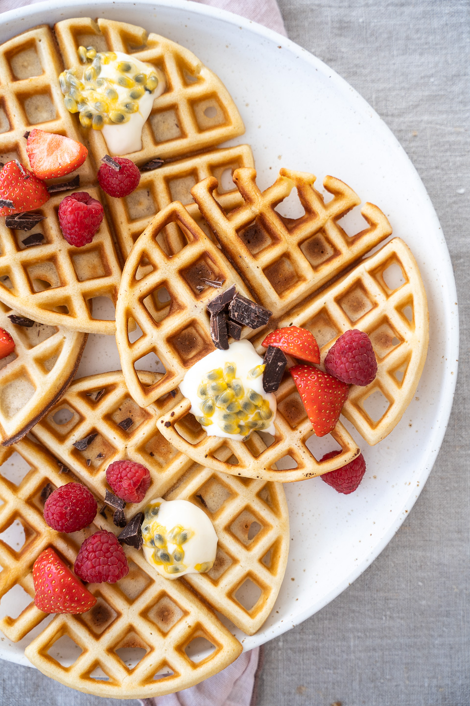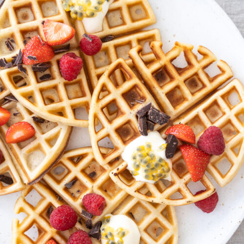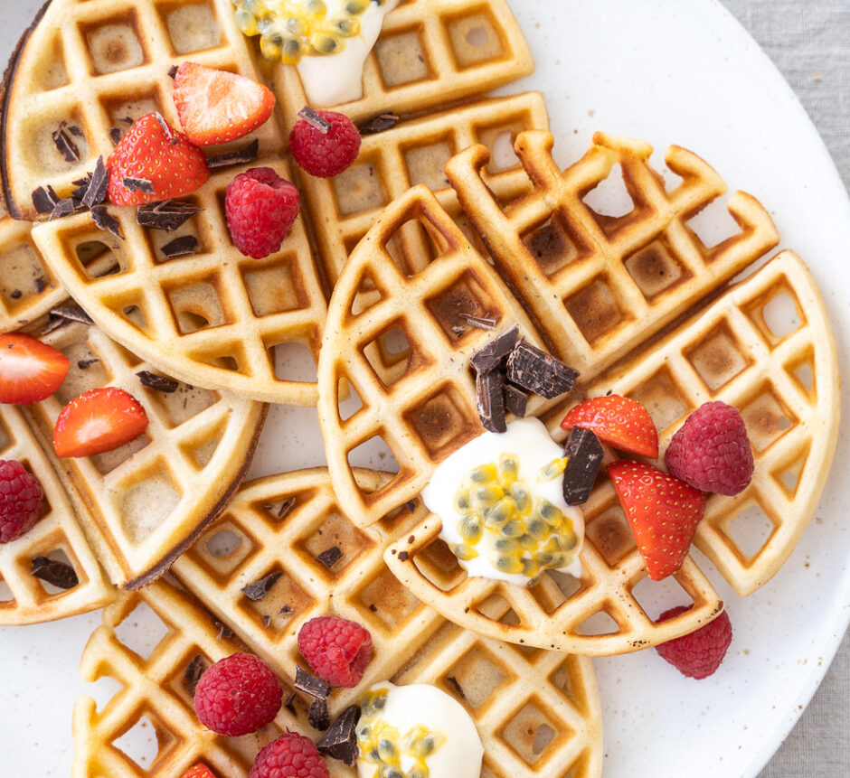 Har du en rest surdej i køleskabet? Så må du prøve at trylle den om til disse lækre vafler med surdej. De får den lækreste konsistens og smag – lidt ala mine surdejspandekager. De er søde, sprøde og lækre – og en lille smule seje. Herhjemme serverer jeg dem gerne med frisk frugt og skyr. Men du kan også servere dem helt som klassiske vafler med marmelade.