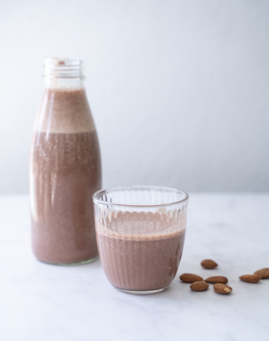 Herhjemme elsker vi iskold kakaomælk. Men nogle gange laver jeg denne lidt ‘sundere’ udgave, hvor sukkeret er skiftet ud med dadler. Jeg tilføjer også 50 g mandler, så kakaomælken bliver ekstra mættende. Det smager skønt og er virkelig nemt at lave. Jeg vil dog anbefale, at man bruger en kraftig blender.