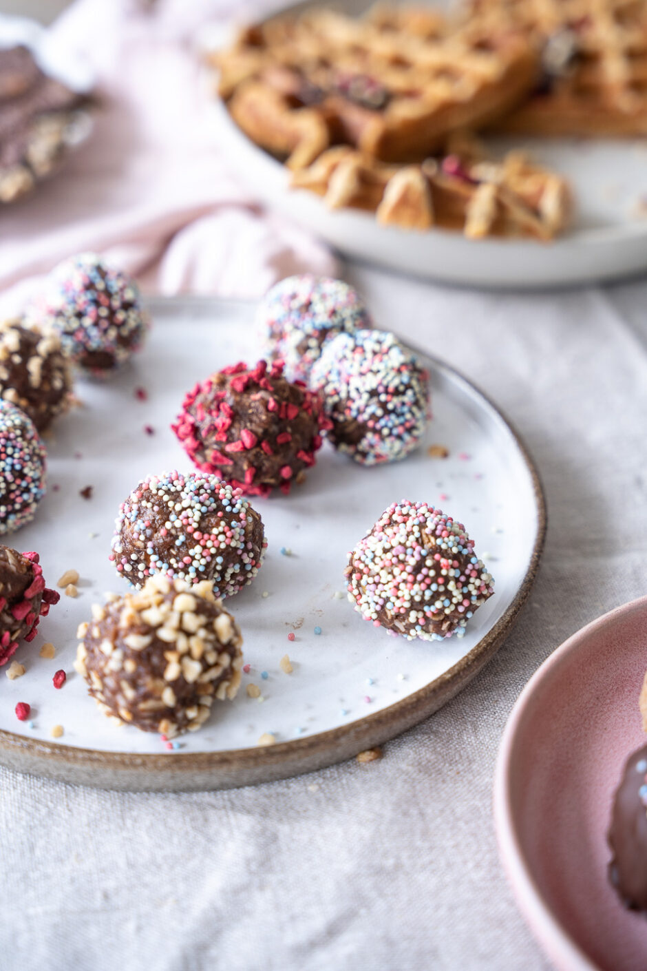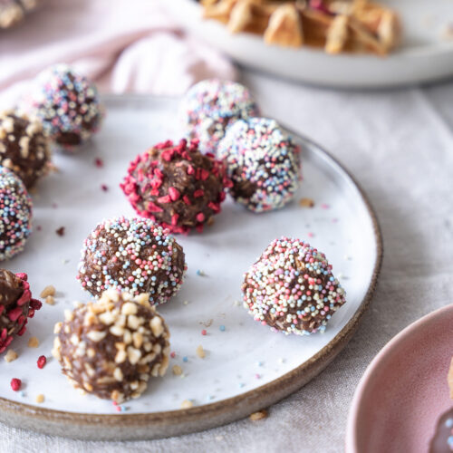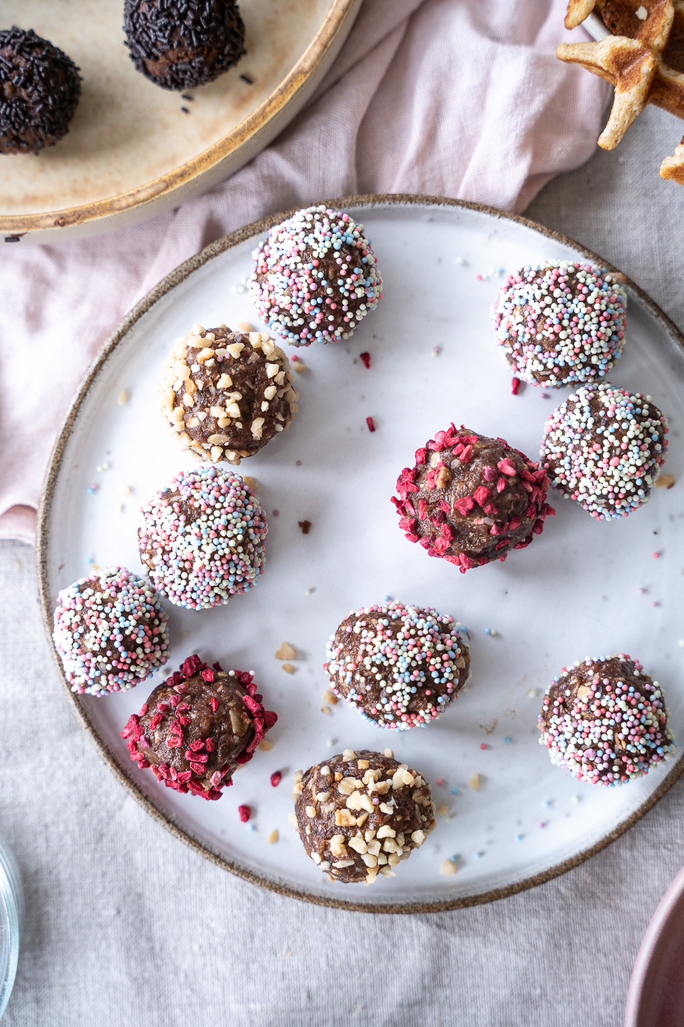- Tril dem derefter til kugler og tril dem i ønsket topping.