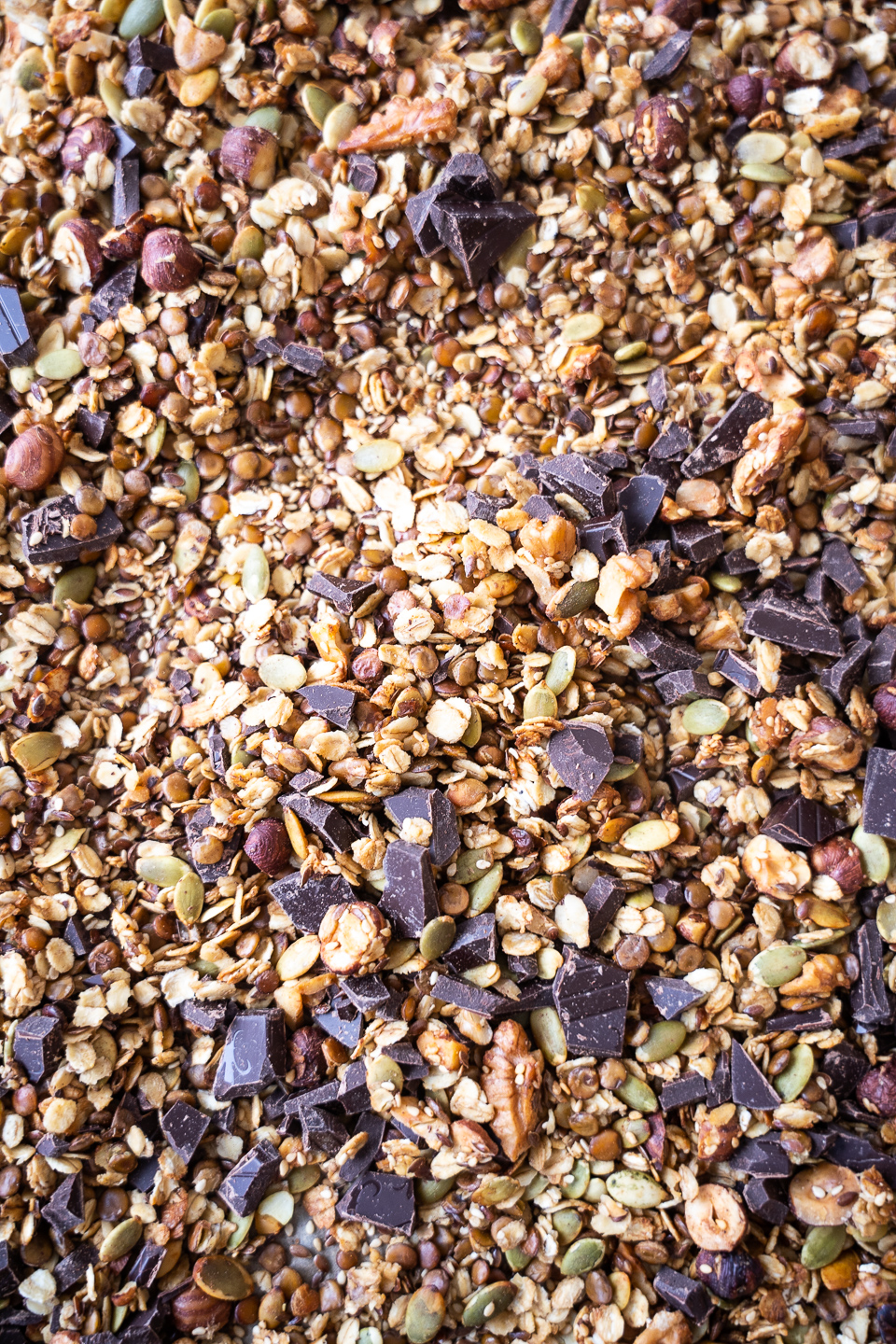 Granola med linser er den lækreste, sprøde og smagfulde granola. I denne granola har jeg brugt forskellige nødder og kerner – og til sidst vendt mørk chokolade i.