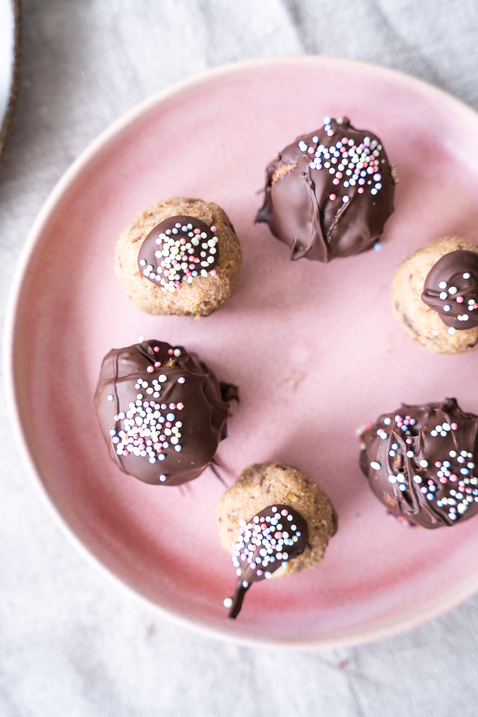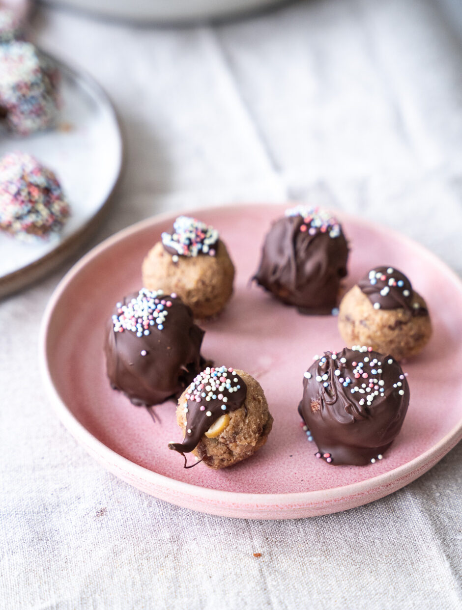 - Tril kuglerne i smeltet chokolade og krymmel.