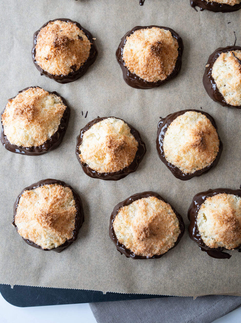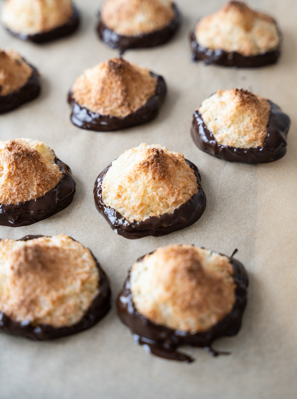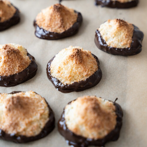 Nem opskrift på kokosmakroner med mørk chokolade. Lækre, saftige og med den skønneste smag af kokos.