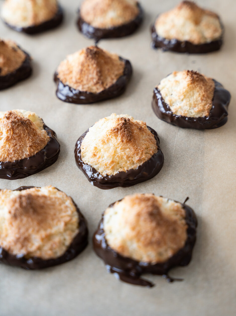 Disse kokosmakroner med chokolade er en nem og hurtig småkage, som kun kræver få ingredienser. De har en dejlig sød kokossmag, en let sprød overflade og en blød midte – og så bliver de ekstra lækre, når bunden dyppes i mørk chokolade.