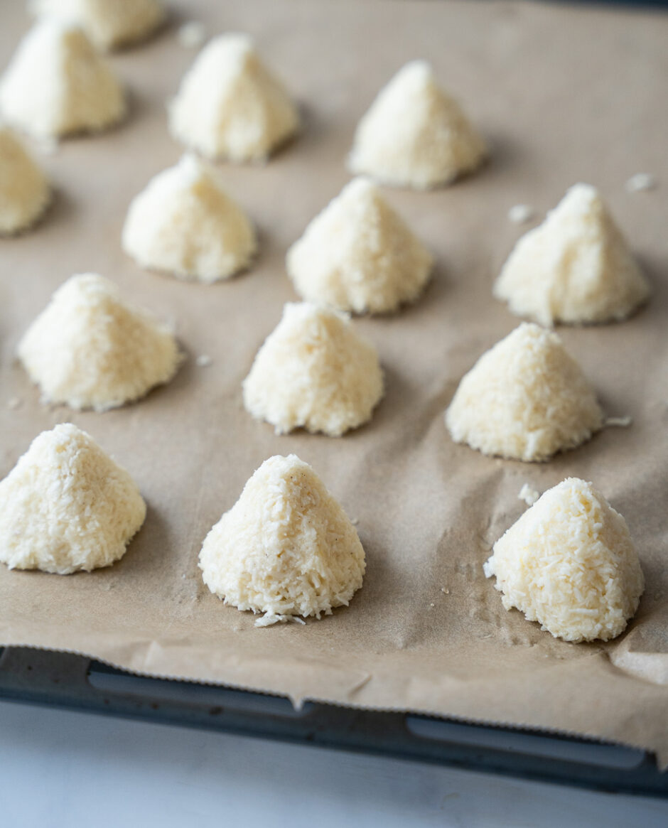 Opskriften er simpel: æg, sukker, vaniljesukker og kokosmel røres sammen til en kokosmasse, som efter en kort hviletid formes til små kugler og bages i ovnen. Under bagningen vil kokosmakronerne flyde lidt ud, så de bliver ikke helt så høje som klassiske makroner. Til gengæld får de en skøn sprød kant og en lækker, saftig midte. Jeg hader tørre kokostoppe. Så jeg prioriterede en saftig midte, men de flød lidt ud.