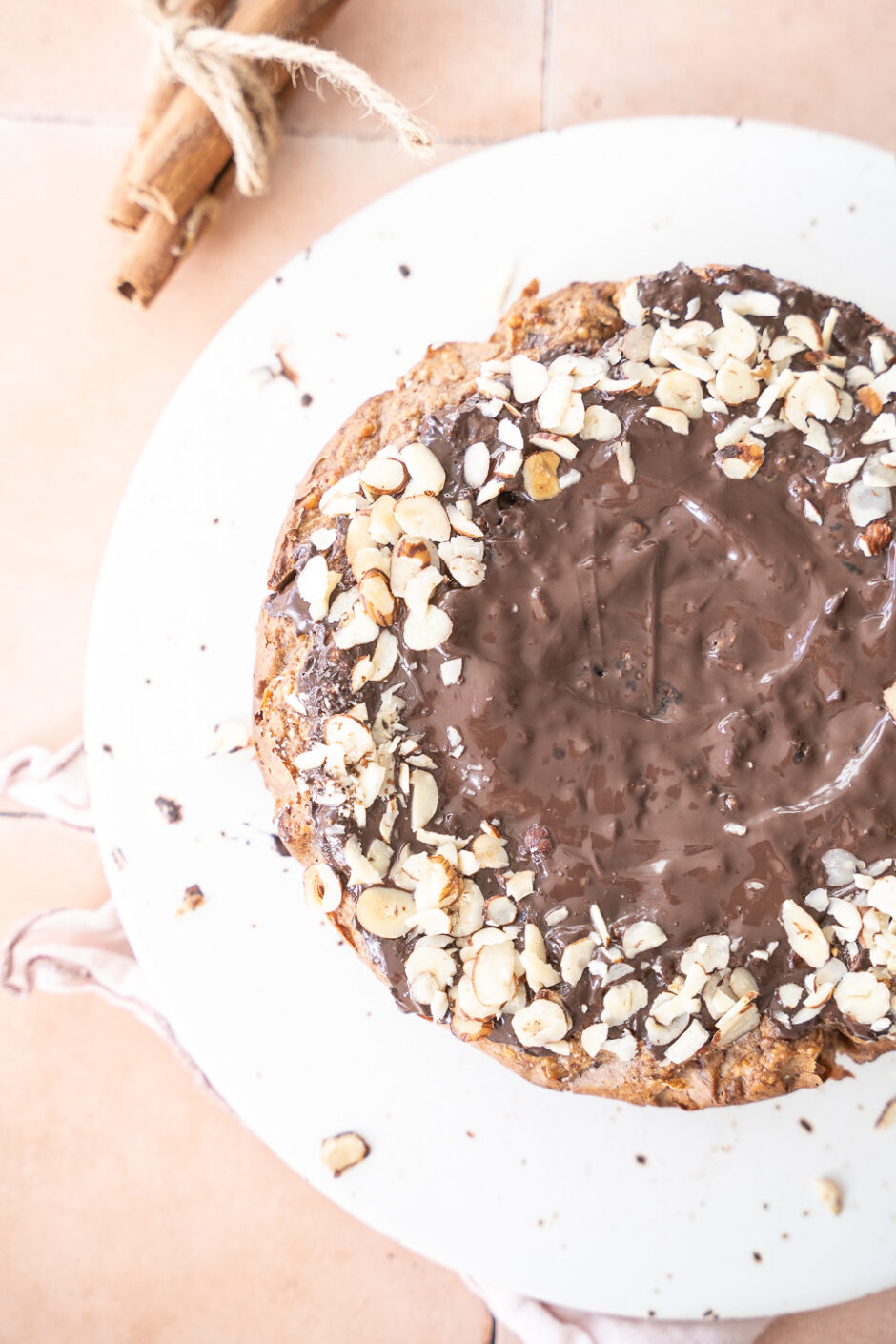 - Tag kagen ud og fordel chokoladen på en varme kage, så det smelter. Smør det ud med en ske. Drys med nøddeflager
